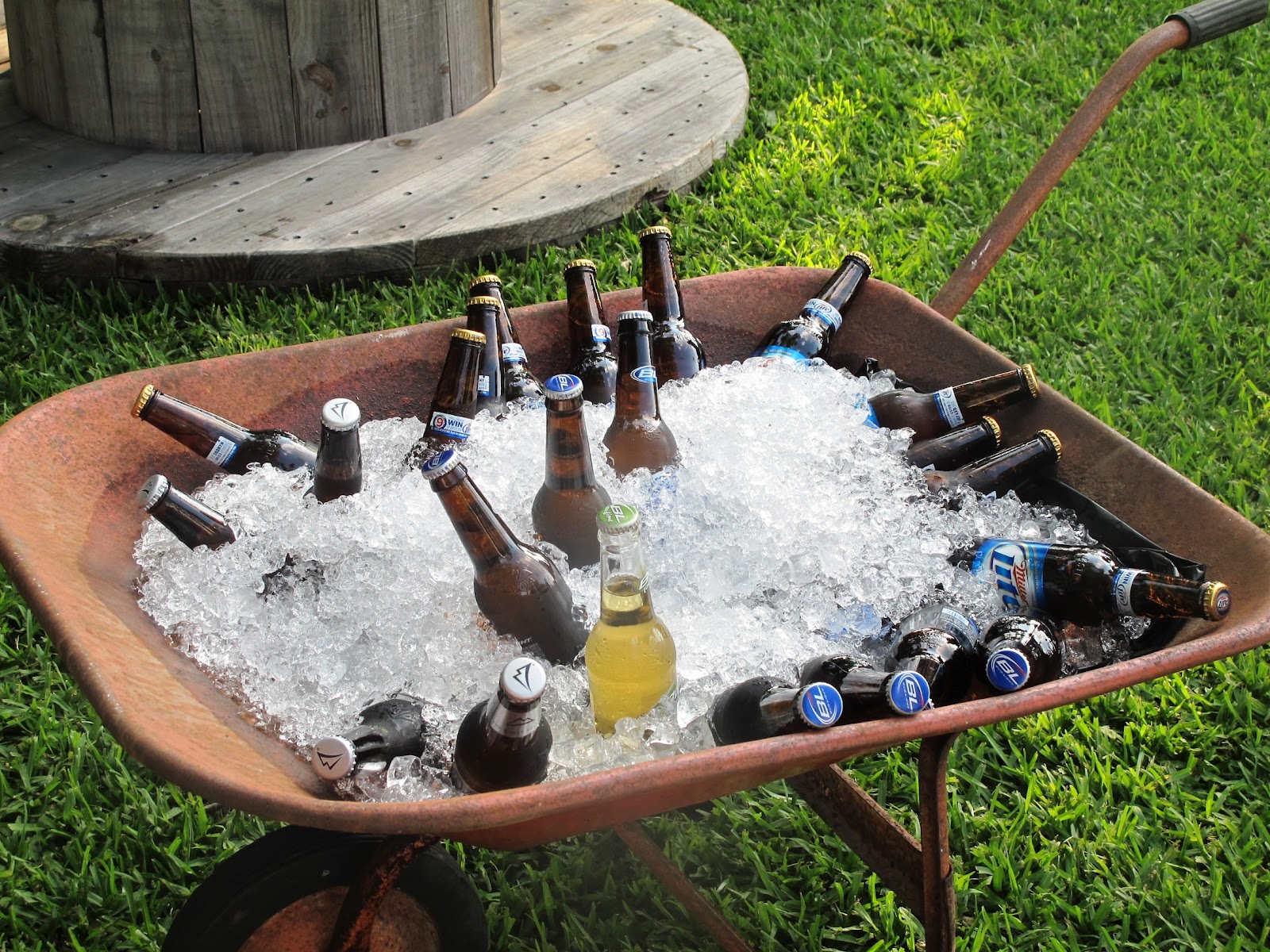 The backdrop of the bar included a grouping of galvanized buckets on the fence. Cable wire tables were used with a galvanized bucket on top which held the beer and wine and a clay flower pot which held the tops. We also placed a wheelbarrow full of drinks and an old blue vintage cabinet with chicken wire held the wine and mason jars.